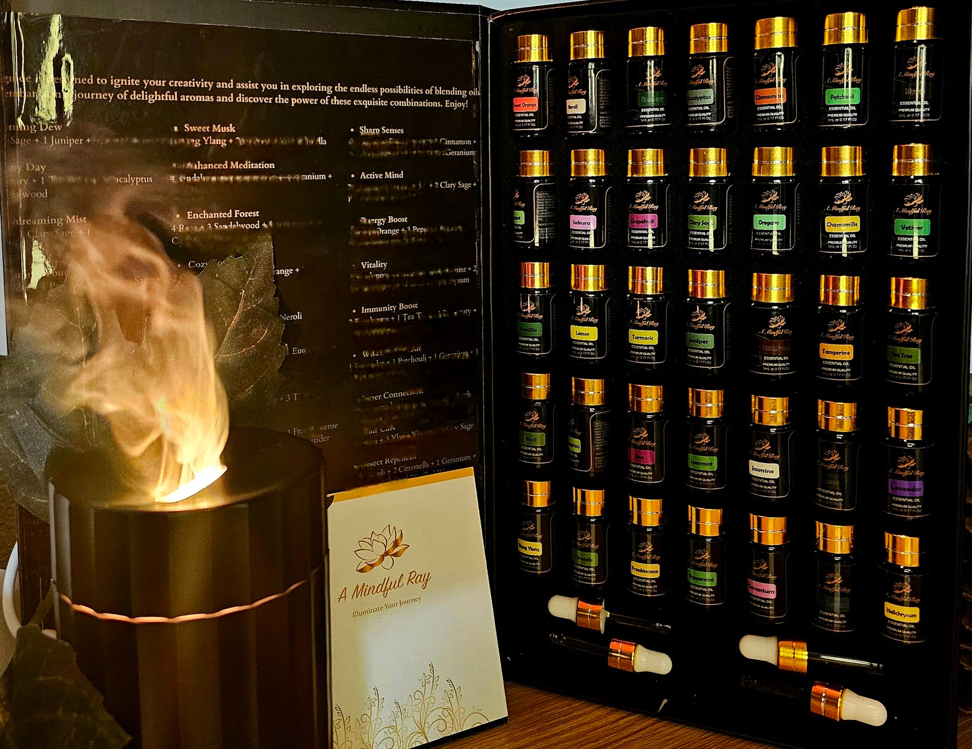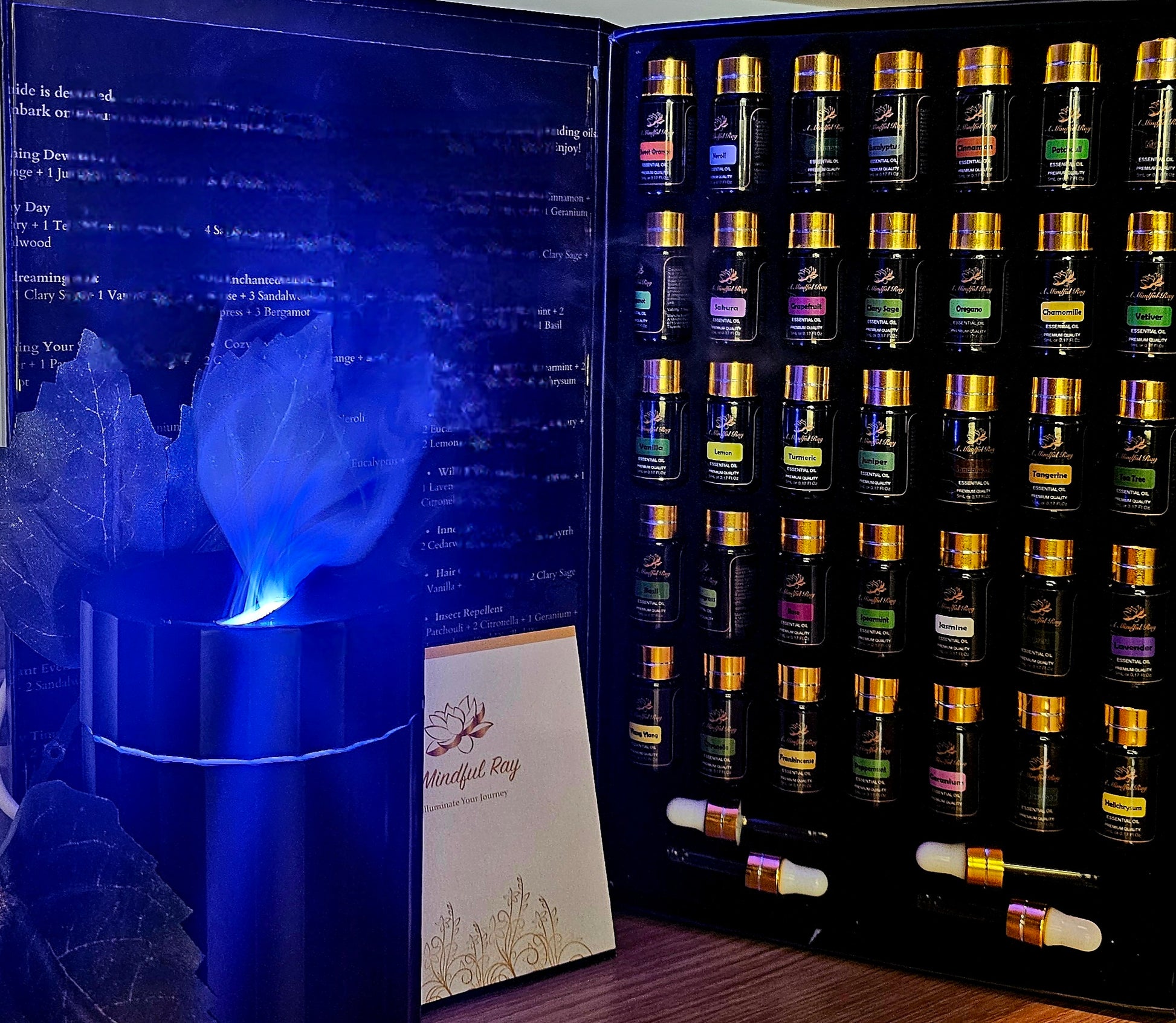 - Oils: Basil, Bergamot, Cedarwood, Chamomile, Cinnamon, Clary Sage, Citronella, Cypress, Eucalyptus, Frankincense, Geranium, Grapefruit, Helichrysum, Jasmine, Juniper, Lavender, Lemon, Lemongrass, Myrrh, Neroli, Oregano, Patchoulli, Peppermint, Rose, Rosemary, Sakura, Sandalwood, Spearmint, Sweet Orange, Tangerine, Tea Tree, Turmeric, Vanilla, Vetiver, Ylang-Ylang.